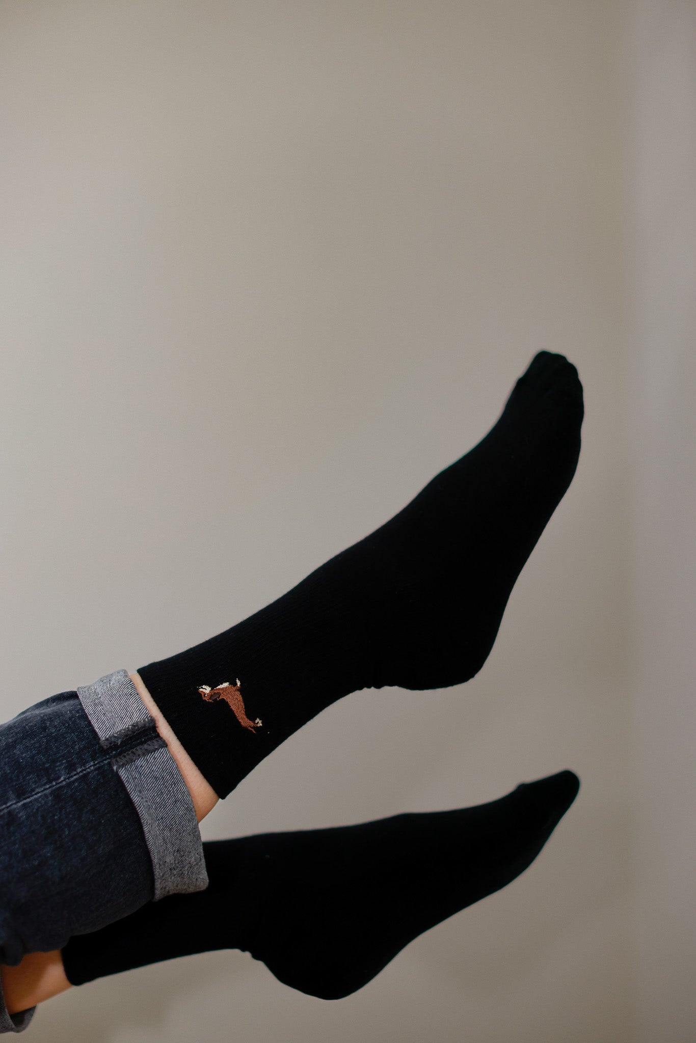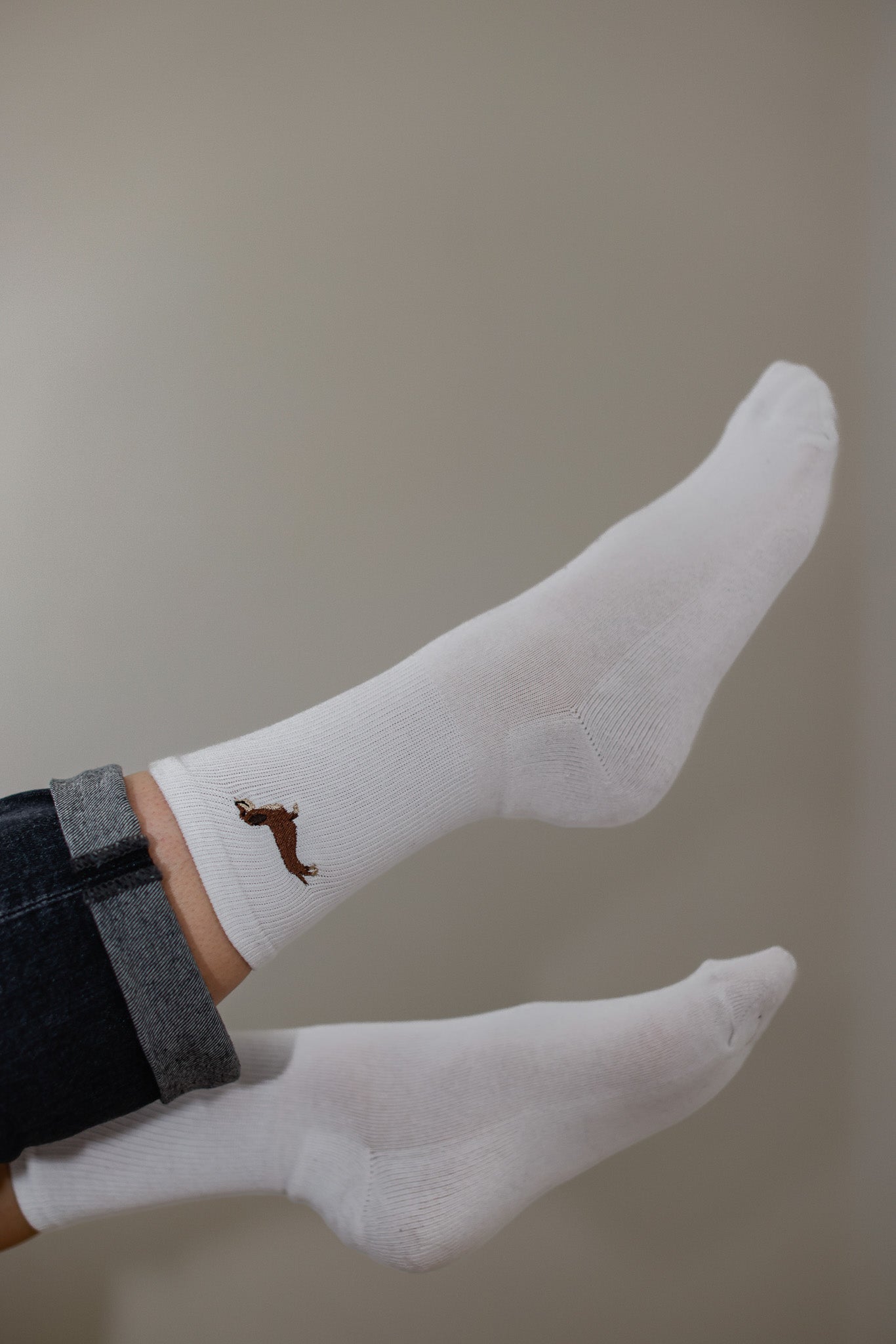 Unleash your playful side with our Conrad the Wire-Haired Dachshund Socks. These socks, available in black and white, showcase the distinctive wire-haired charm of Conrad the Dachshund, adding a dash of character to your outfit. Crafted with care and designed to bring joy, these socks are a unique blend of comfort and style. Walk confidently knowing you've got a loyal companion on your feet, inspiring smiles with every step.